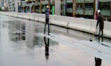 在施工時(shí)也有很多需要注意的地方。如施工時(shí)溫度應(yīng)高于5℃,不宜在陰雨天氣或基部有清水時(shí)施工。完成后,將油漆攪拌均勻,確保使用前沒有沉淀。待涂層干燥后,應(yīng)進(jìn)行下一次刷涂。每次刷的方向好垂直于前一次。當(dāng)此處需要增強(qiáng)層時(shí),應(yīng)在一道涂層后立即應(yīng)用聚酯無紡布或尼龍?jiān)鰪?qiáng)網(wǎng)眼布。涂膜完全干燥約需2-3天,潮濕環(huán)境應(yīng)適當(dāng)延長。待完全干燥后進(jìn)行儲(chǔ)水試驗(yàn)。也可以用水稀釋油漆,加水量不超過油漆量的10%。